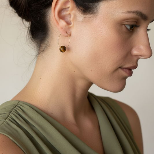 Single Bead Hoop Earrings - Tiger Eye on Stainless Steel