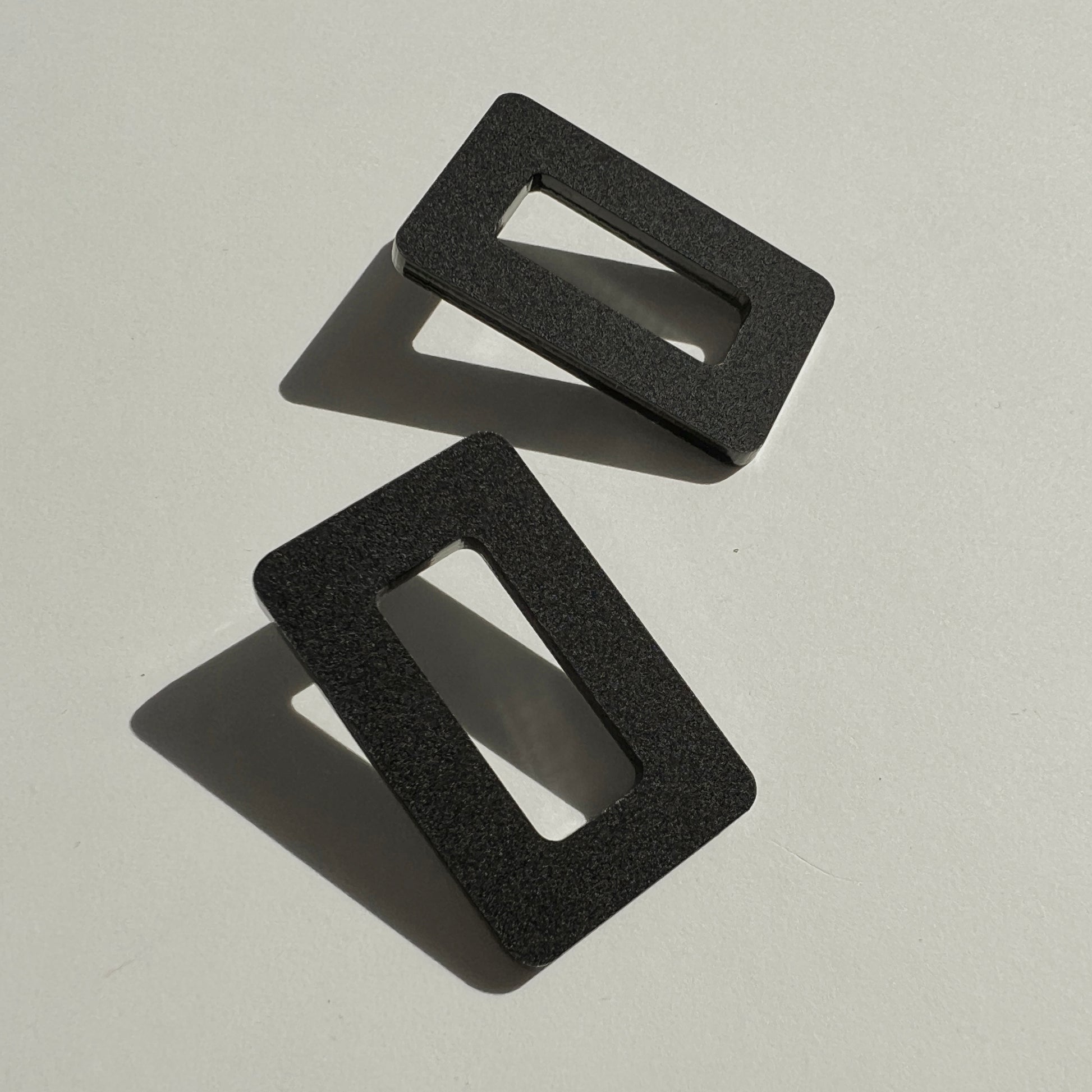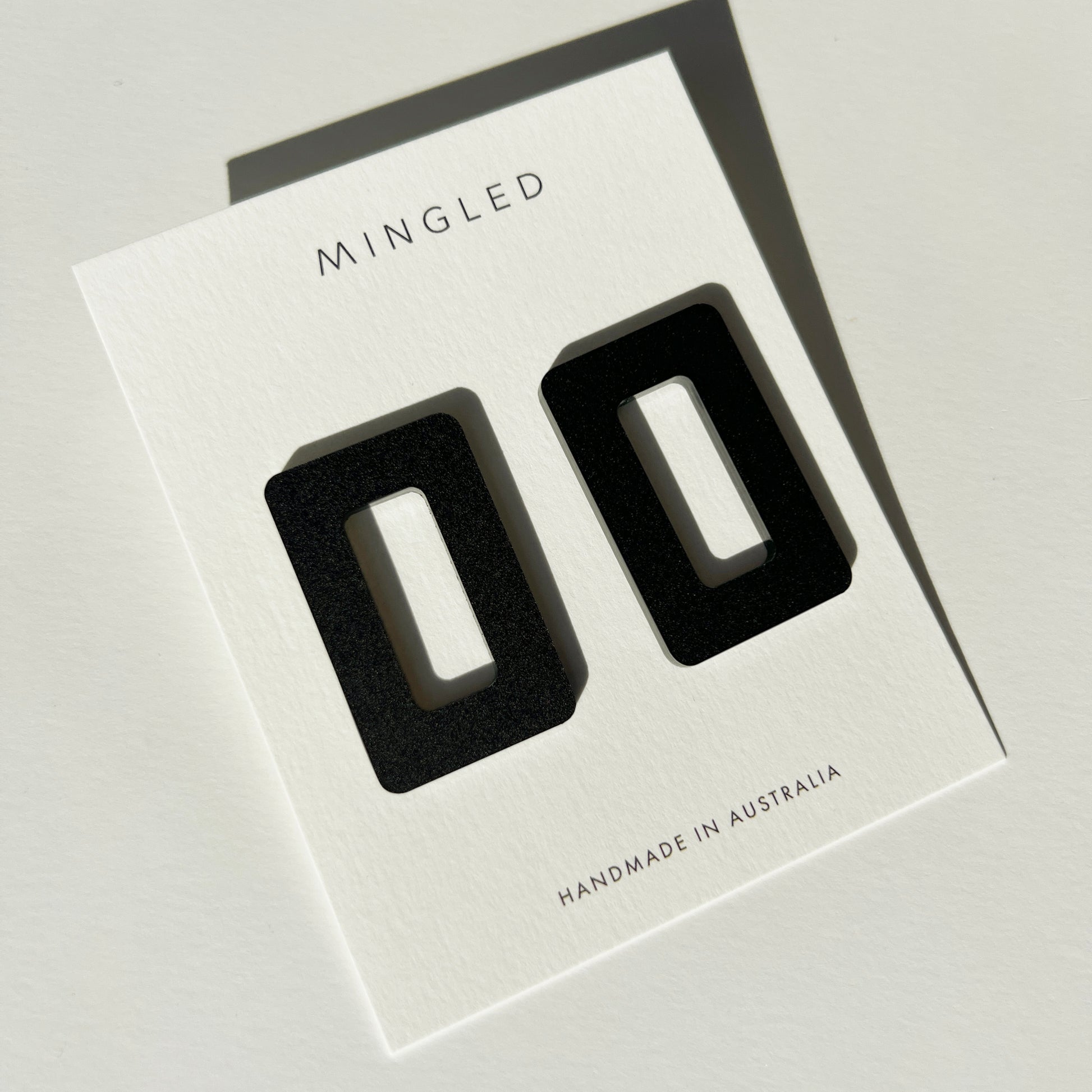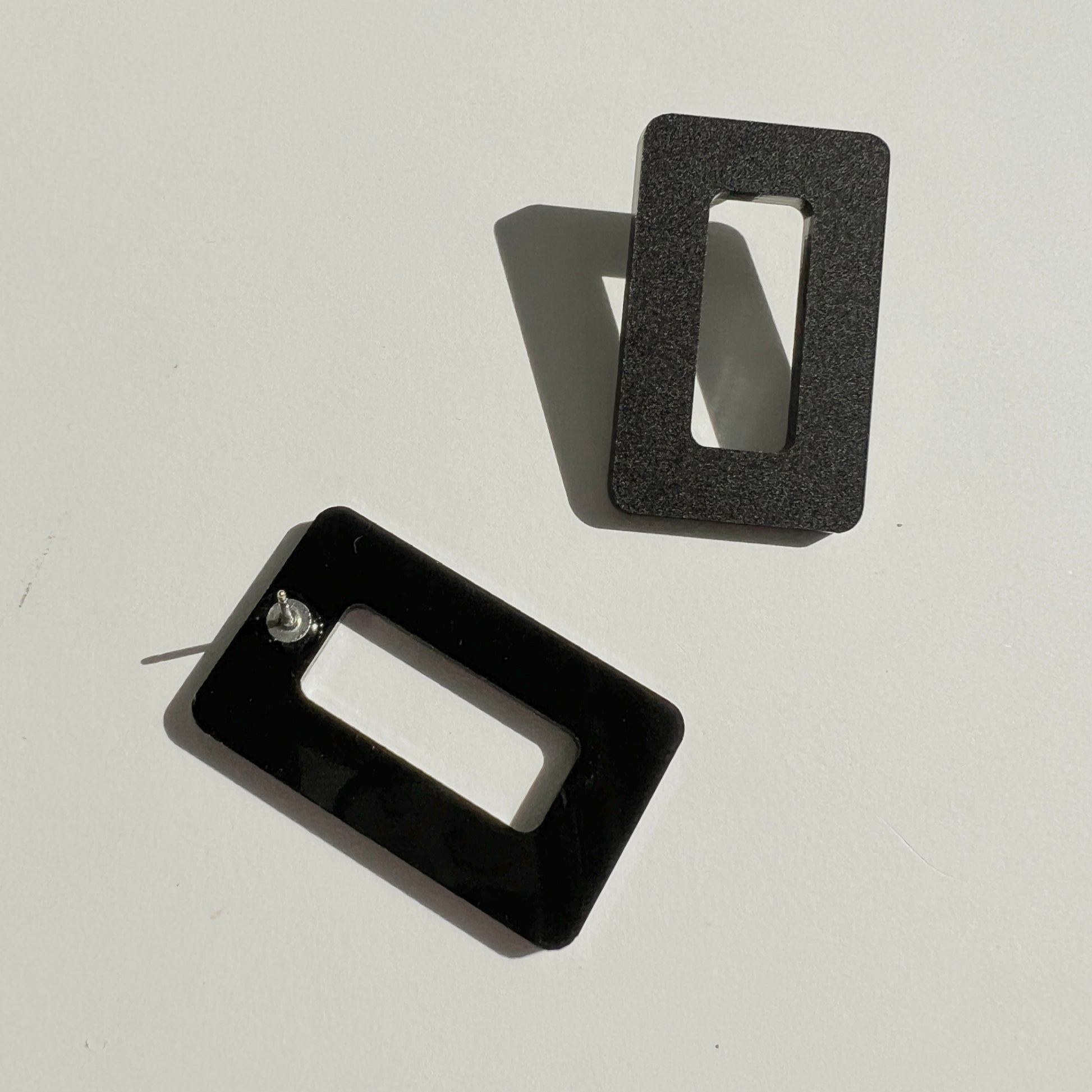 The rectangle stud earrings in luxe matte black, are a super cool stud in a modern and minimalist style and so on-trend with the geometric shape. The laser cut acrylic shape is super lightweight and they have surgical steel earring posts making them hypoallergenic and perfect for sensitive ears.