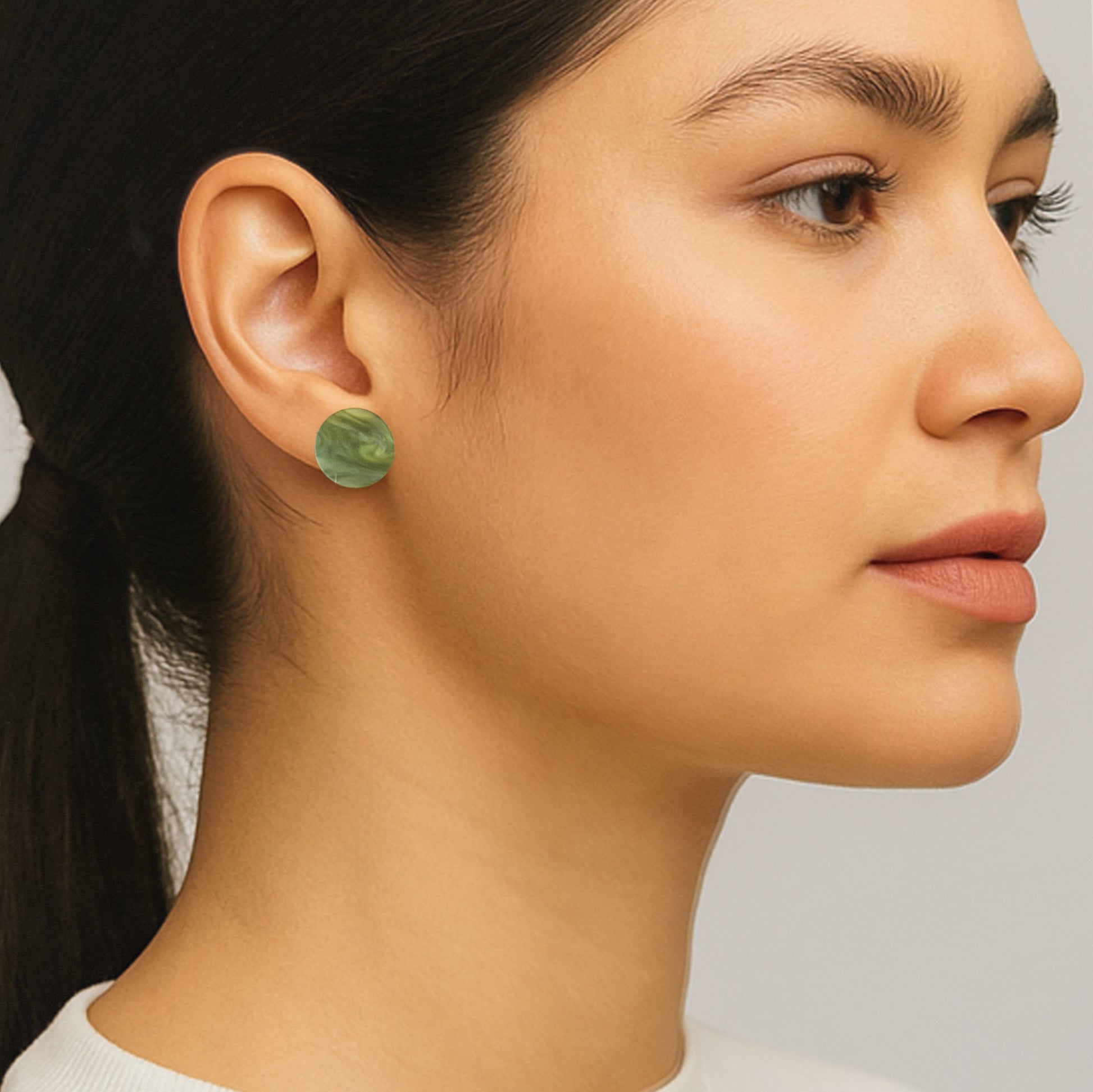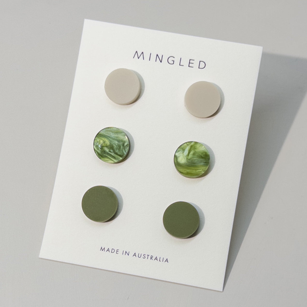 Set of 15mm round circle flat studs in matte ivory beige, moss and matte olive green.