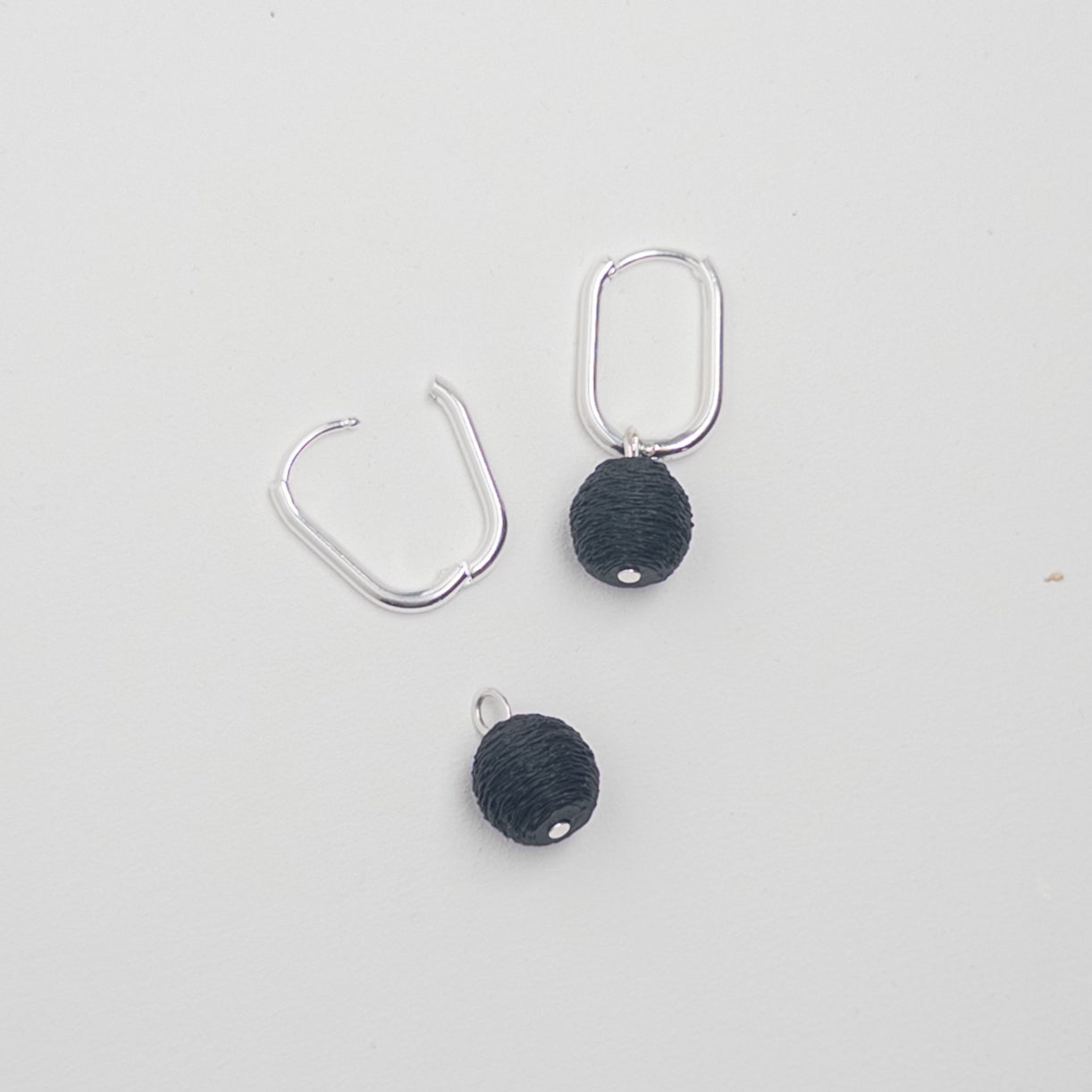 Silver Oval Huggie Earrings with Removable Matte Black Bead Charm