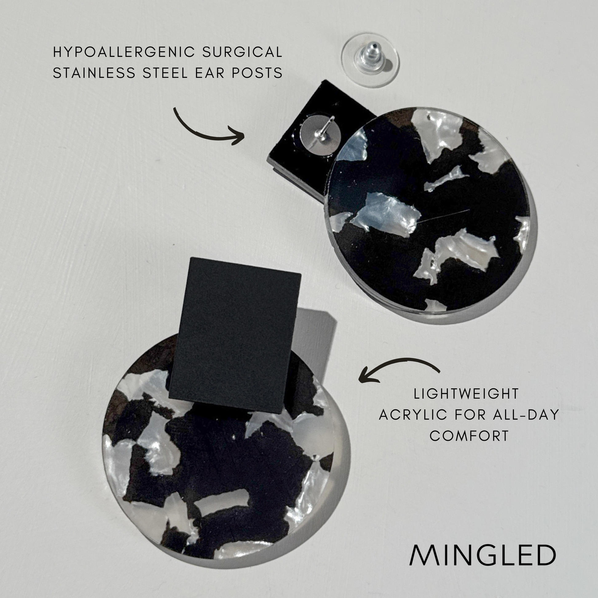 Elevate your look with the Solara Black and White Pearl Statement Studs, handmade from lightweight acrylic for a luxe look without the weight.