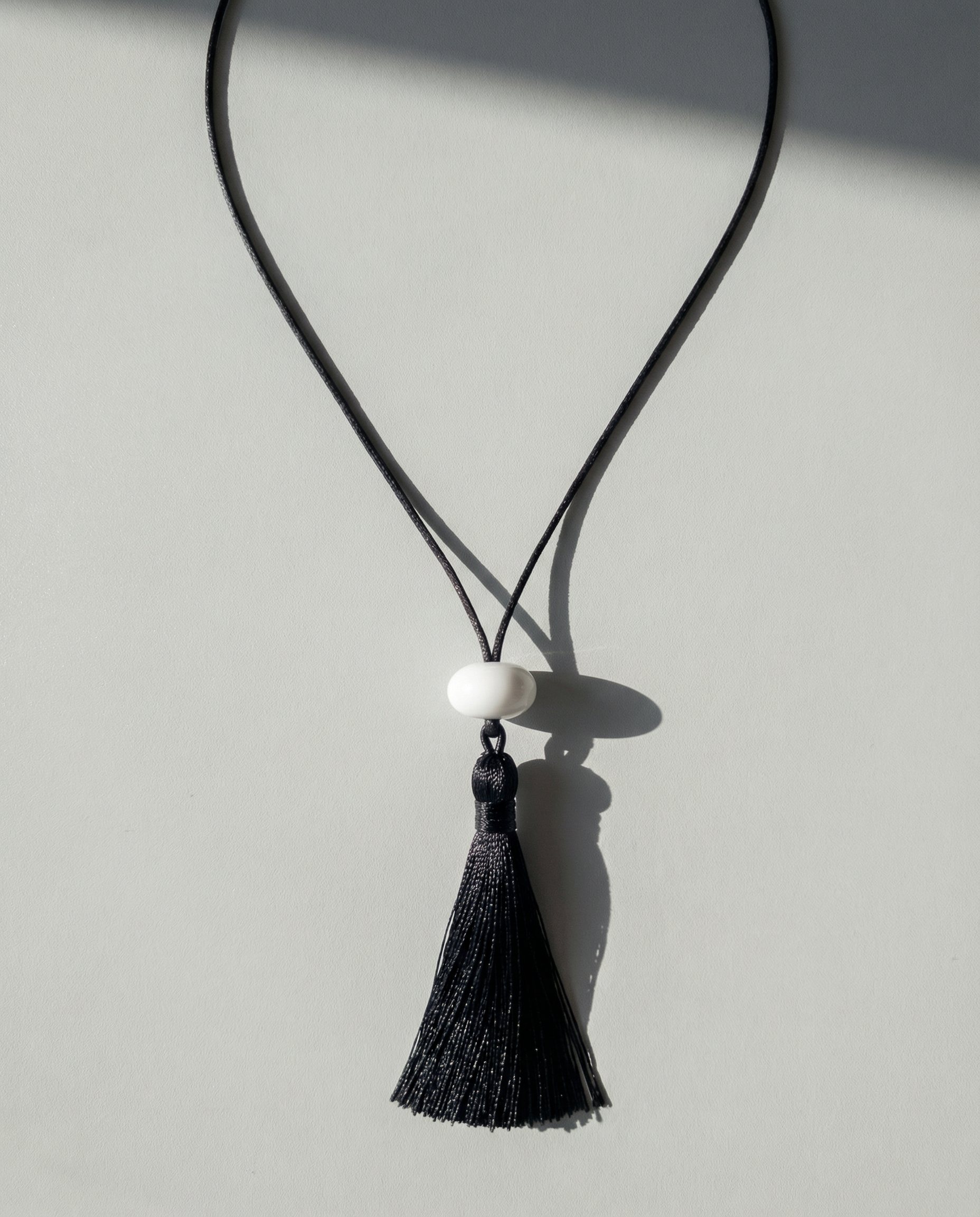The Tassel Necklace features a White Lucite Bead with a Black Silk Tassel hanging from an adjustable black cotton cord.